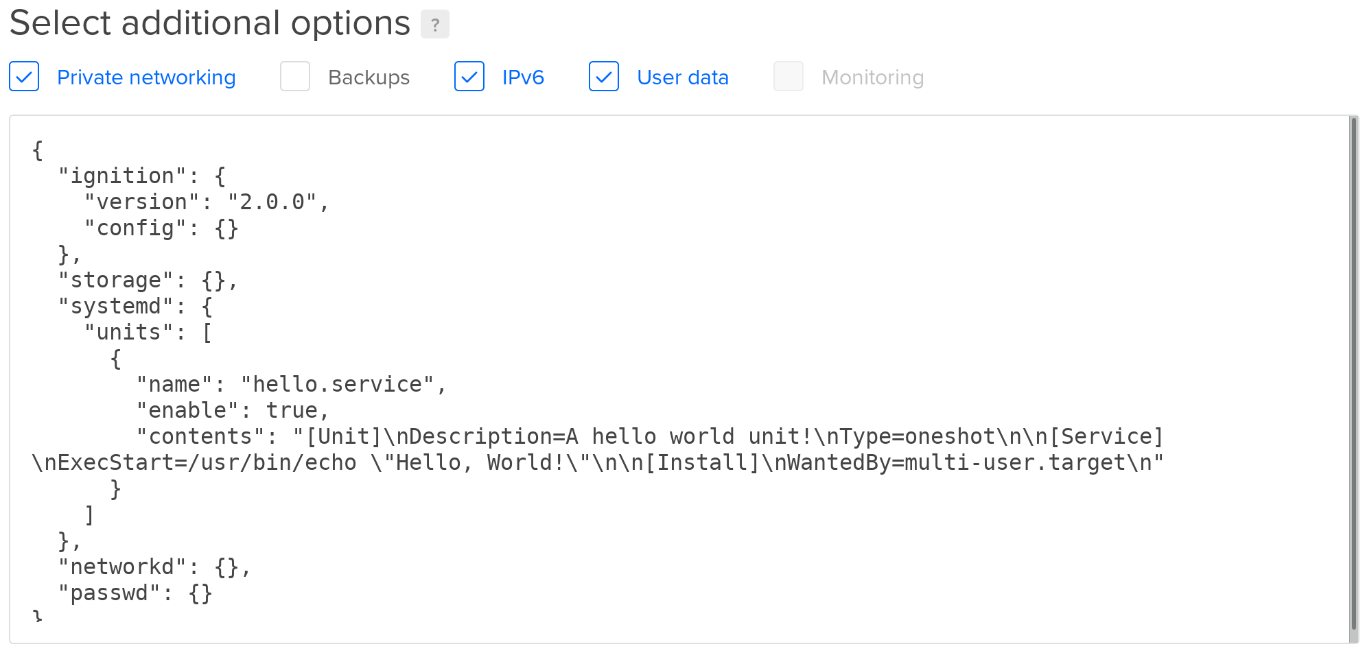 Flatcar Container Linux allows you to configure machine parameters, configure networking, launch systemd units on startup, and more via Butane Configs. These configs are then transpiled into Ignition configs and given to booting machines. Head over to the docs to learn about the supported features . Note that DigitalOcean doesn’t allow an instance’s userdata to be modified after the instance has been launched. This isn’t a problem since Ignition only runs on the first boot.